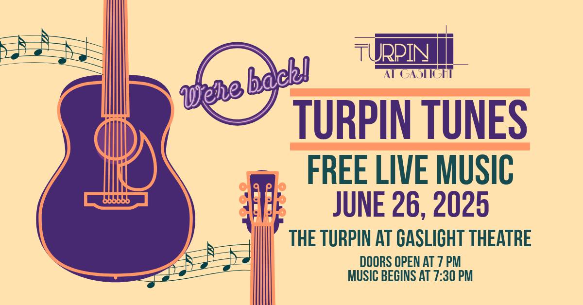 Join us for free live, local music in the newly remodeled Turpin at Gaslight Theatre! Doors open at 7 pm, music starts at 7:30 pm. Cash bar available.